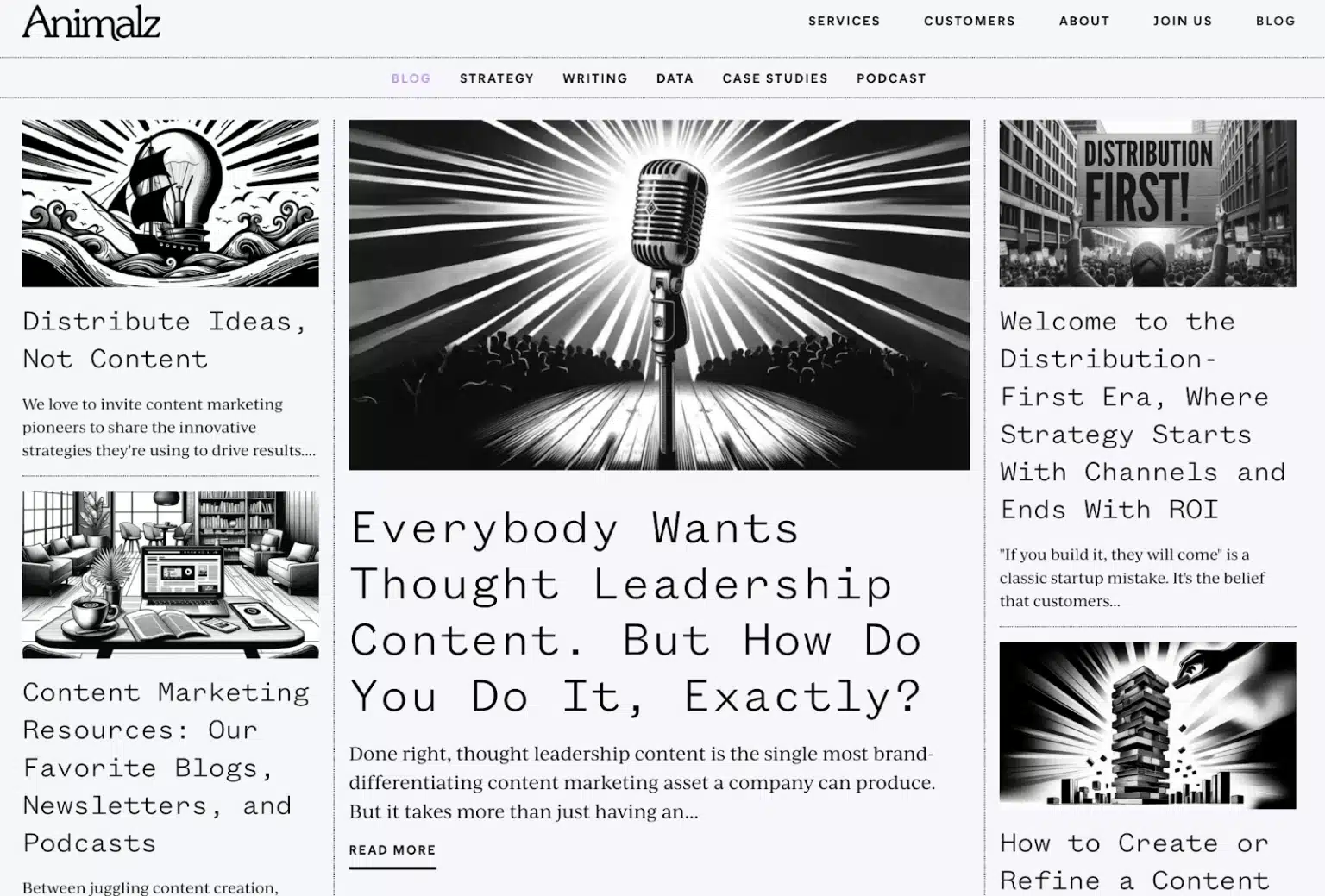 Blogs are a great way to showcase your agency’s expertise, boost organic traffic, and provide a behind-the-scenes peek. Your blog should include topics that your clients are interested in and that relate to your offerings. For example, if you offer a range of AI tools and services, you might have blog posts about AI startup ideas, using AI for coding, or making money with AI art. Consider including CTAs on your blog pages to encourage visitors to further engage with your agency. Check out this fantastic blog page from Animalz, with a newspaper-inspired layout that pulls you in.