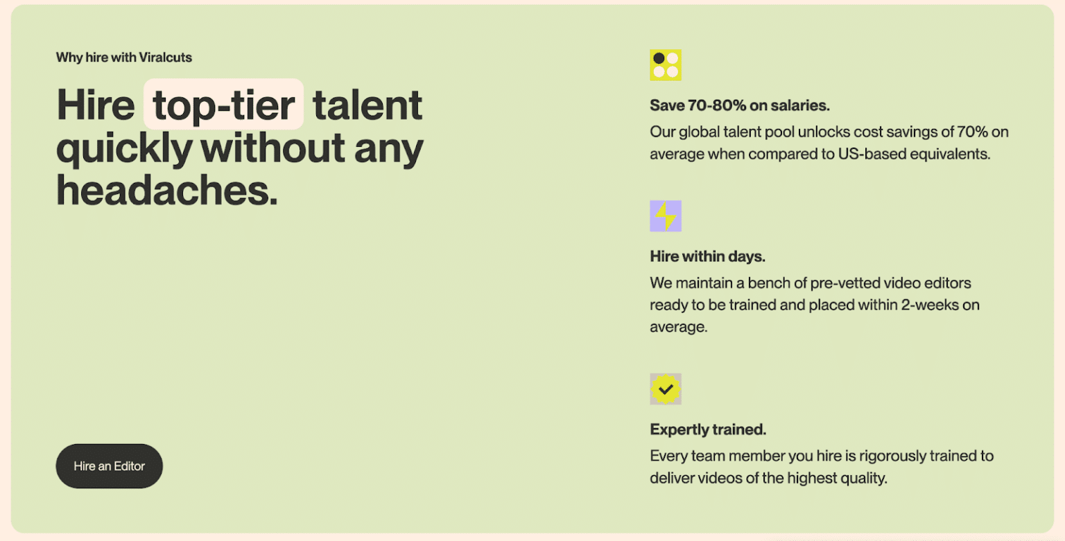 Source Viralcuts place their company description right on their homepage where it’s prominently visible as you scroll down. Visitors instantly understand exactly what this agency can deliver, and the slick, simple design instills a sense of confidence.