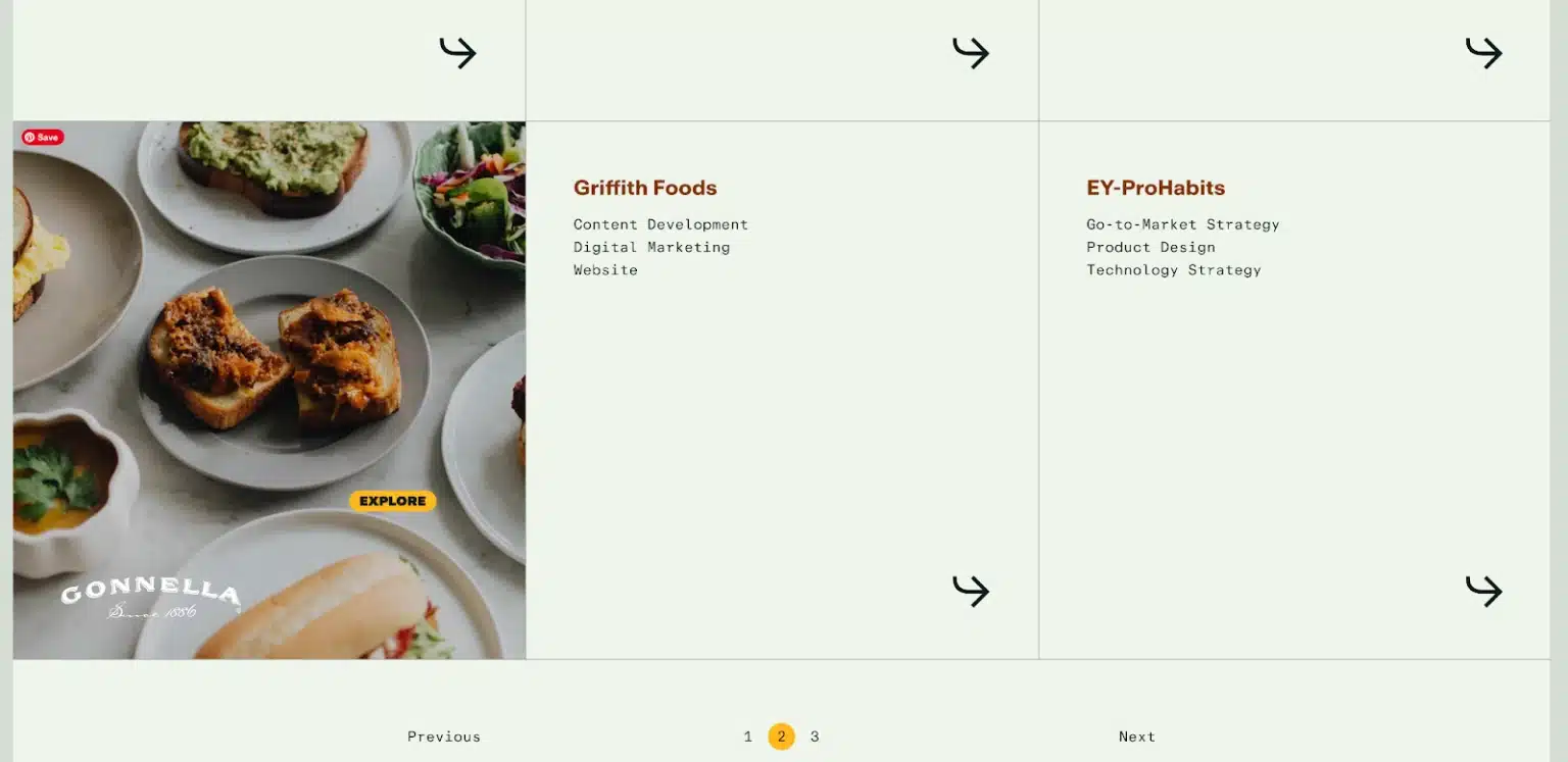 Source Visitors can see the services delivered to each client, and on hover, a bold image is revealed and the cursor changes to the word “explore”, inviting users to click through and read more. This interactive approach maintains a clean design while adding an element of delight that encourages users to engage with the portfolio.