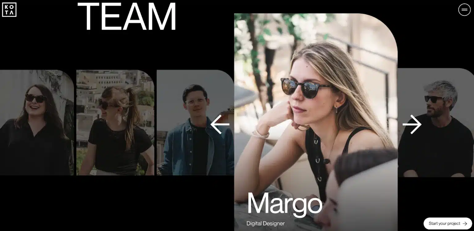 Source Users can click through the slider, and clicking on a team member’s image opens up a panel with more information about their skills and background. Note that the images aren’t your run-of-the-mill corporate headshots: instead, they let each team member choose an image that more accurately portrays their personality.