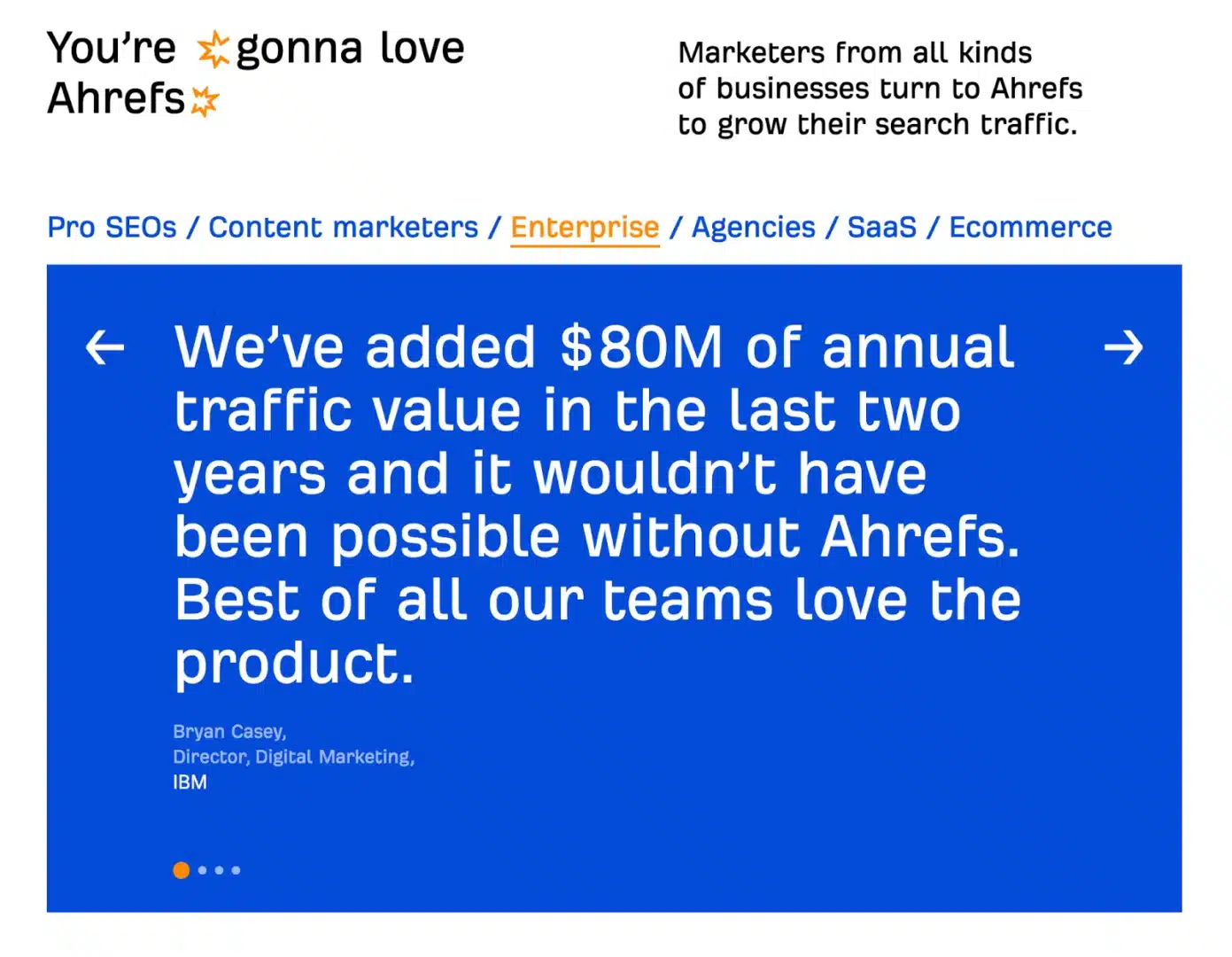 Testimonials are a great way to establish credibility by helping prospects see that others just like them have benefited from your services. While these are often text-based, videos can also be engaging and effective for boosting conversions. Check out this simple example from Ahrefs, which lets visitors click on the type of testimonial they want to see, including testimonials from content marketers, enterprise clients, and agencies.