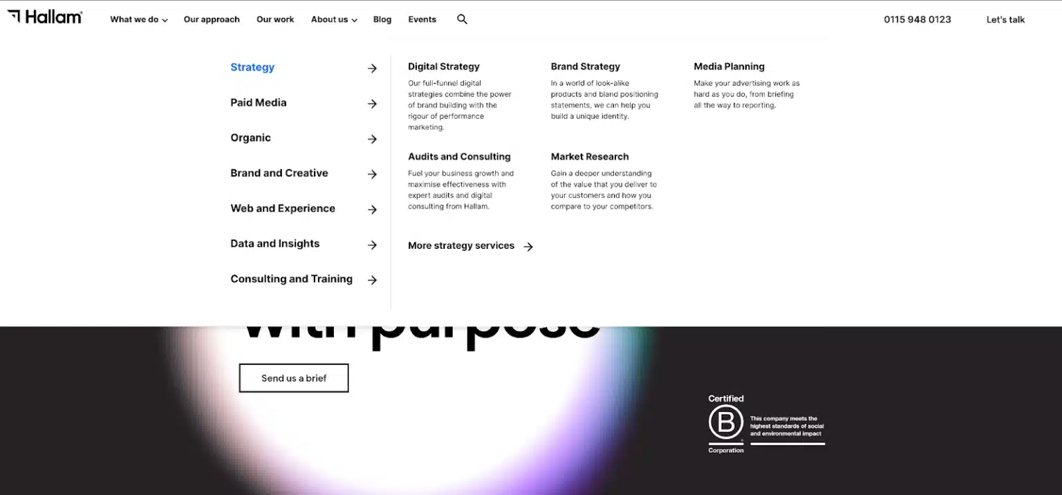 Marketing agency services can vary considerably, confusing and overwhelming prospects. Your web agency website should make life easier for them, and a simple way to do this is to list your agency services. It’s usually a good idea to provide a detailed description, especially for newer technologies like AI funnels or other AI services that may be unfamiliar to clients. An effective way to do this is with a mega menu, like this example from Hallam.