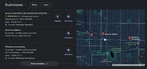 In addition to the listing that appears when users search for a specific business like in the example above, Google also displays a list of 3 search results known as the Local Listings, Local Pack, or Google 3-pack when people search for a related term, such as “accounting firms near me”. This list includes the top three businesses that match the search query, along with a map showing their locations: